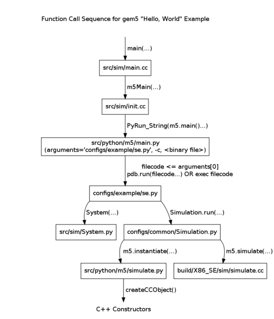 The figure below shows the function call sequence for the initialization of gem5 when running the "Hello, World" example given in the Introduction section. Each node in the graph gives the path to the source code file in which the function is located. This representation should aid in the first steps of familiarization with the basic initialization steps of gem5, including how the configuration files are used and how the objects are constructed.