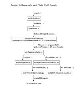 The figure below shows the function call sequence for the initialization of gem5 when running the "Hello, World" example given in the Introduction section. Each node in the graph gives the path to the source code file in which the function is located. This representation should aid in the first steps of familiarization with the basic initialization steps of gem5, including how the configuration files are used and how the objects are constructed.